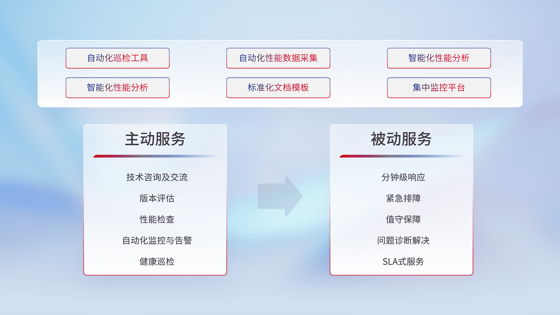 智能化工具和标准化文档,,保障服务质量,,提供主动服务(包含技术咨询、、版本评估、、、性能检查、、、、自动化监控与告警、、健康巡检)和被动服务包含(分钟级响应、、、、紧急排障、、、值守保障、、问题诊断解决、、、SLA服务)。。。。